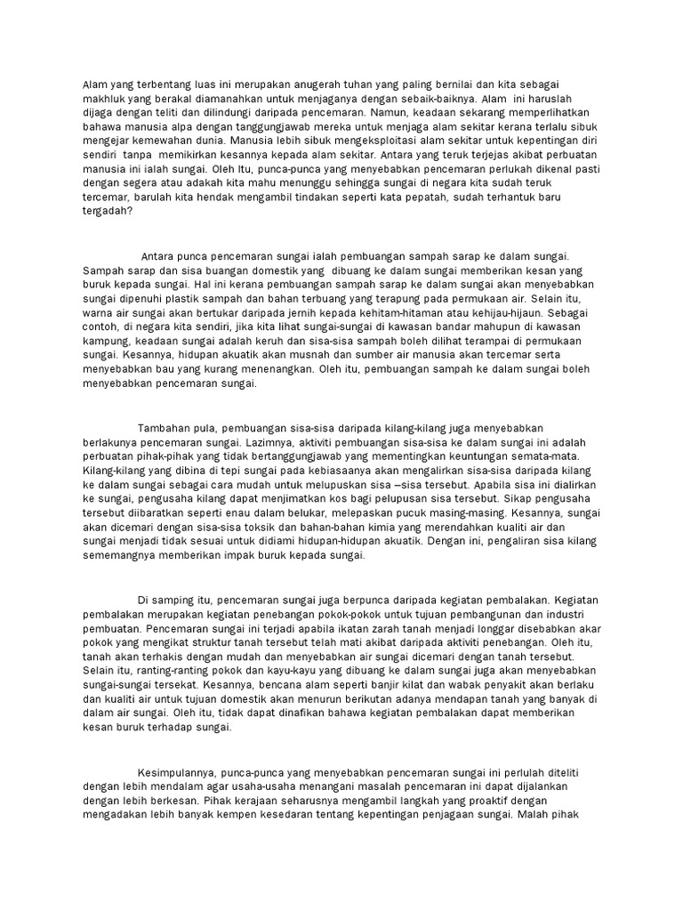 Laman Blog Cikgu Tan Cl Karangan Bergambar Pmr Kesan Pencemaran Sungai Kesan Math Sheet Music from i.pinimg.com Ia akan mendatangkan kesan yang sangat buruk kepada sungai. Kebanyakan kilang dibina di sepanjang sungai untuk memastikan. Pencemaran juga boleh berlaku akibat aktiviti perkilangan seperti pembuangan sisa toksik ke dalam sungai dan tasik. Bekalan air yang terputus ini secara tidak langsung menyusahkan para pengguna. Tiada nilai peka • masalah persekitaran juga dilihat sebagai masalah sosial yang menjadikan manusia dan alam sekitar terlibat sekali. Kilang punca pencemaran di loji rawatan air sungai semenyih disita. Punca pencemaran secara umumnya pencemaran boleh berpunca daripada alam semulajadi dan kesan aktiviti manusia.kebakaran hutan akibat panahan petir dan letupan gunung berapi merupakan pencemaran yang diakibatkan oleh alam semulajadi. Ketua setiausaha kasa, datuk seri dr zaini ujang berkata.